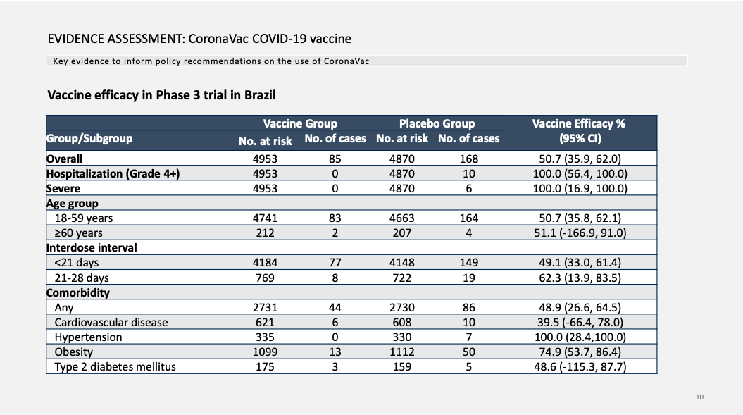 巴西:随机试验,预防有症状的新冠肺炎效力51%,预防住院效力100%。看新闻:目前考虑数值较低的原因是间隔时间短(14天)、接种的是医务人员。(这一句不是who报告原内容)