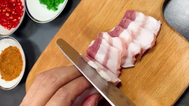 首先,准备1块新鲜的三层五花肉,洗净后,再改刀切成厚片,厚度控制在3-5毫米以内,且形状为连皮带肉,状态如上图所示,家中有条件的建议优先选用黑猪肉,肉质非常重要。