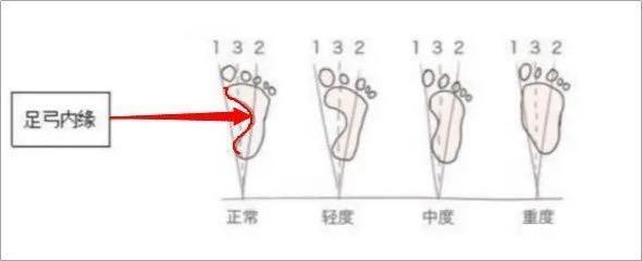 中度扁平足的足弓内侧缘在内侧(下图右二);